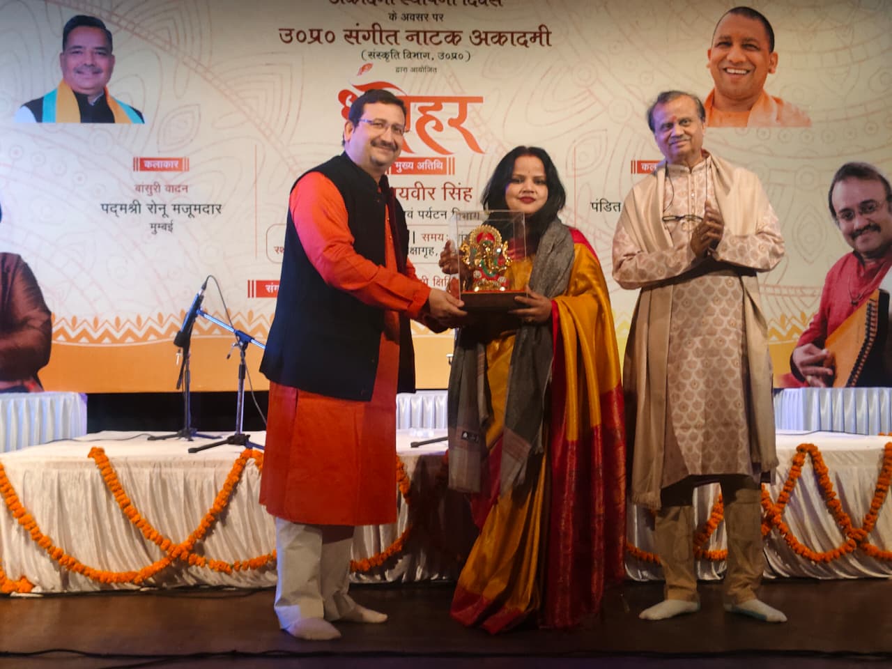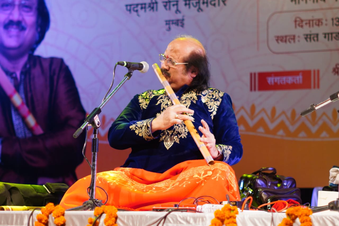 सांस्कृतिक कार्यक्रम का आरम्भ पुणे से पधारे प्रतिष्ठित गायक पंडित रघुनंदन पणशीकर ने अपनी गायकी का आगाज राग यमन से किया। उन्होंने अपने गुरु किशोरी अमोनकर जी को नमन करते हुए उनकी मशहूर रचना “मो मन लगन लागी” सुनायी। इस क्रम में उन्होंने पारंपरिक द्रुत रचना “ए री आली पिया बिन” और अंत में उन्होंने भक्ति संगीत के तहत पंडित भीमसेन जोशी और लता मंगेशकर जी का मशहूर भजन “बाजे रे मुरलिया बाजे” सुनाकर प्रशंसा अर्जित की। आपके साथी कलाकारों में हारमोनियम पर क्षितिज सिंह, तबले पर विनोद लेले ने प्रभावी संगत दी वहीं तानपुरे और गायन में राजपाल सिंह और अपर्णा पणशीकर ने साथ दिया। द्वितीय प्रस्तुति मुम्बई के कलाकार पद्मश्री रोनू मजूमदार का सुमधुर बांसुरी वादन किया। उन्होंने ‘राग झिंझोटी’ में अलाप से राग के स्वरूप को प्रभावी रूप से पेश किया वहीं उत्तरोत्तर जोड़, झाला एवं ‘रूपक ताल’ की इस मनोरम प्रस्तुति से उपस्थित श्रोताओं से प्रशंसा प्राप्त की। आपके साथ बांसुरी पर अथर्व प्रताप सिंह ने साथ दे कर पद्मश्री रोनू मजूमदार का आशीर्वाद हासिल किया। तबले पर सपन अंजरिया संगत दी। इस अवसर पर ग्वालियर स्थित राजा मानसिंह तोमर संगीत विश्वविद्यालय के पूर्व कुलपति प्रो.साहित्य कुमार नाहर, बिरजू महाराज कथक संस्थान की अध्यक्ष डॉ. कुमकुम धर, उपाध्यक्ष मिथिलेश तिवारी, पूर्व आई.ए.एस. अनीता भटनागर जैन, वरिष्ठ गायिका पद्मा गिडवानी सहित कई विशिष्ट जन उपस्थित रहे।